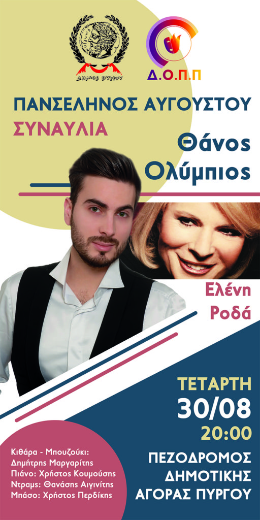 Ο Δήμος Πύργου και ο Δημοτικός Οργανισμός Πολιτισμού Πύργου διοργανώνουν συναυλία με τους Θάνο Ολύμπιο και Ελένη Ροδά, με έντεχνα και λαϊκά τραγούδια του “χθες και του σήμερα”, σε ένα ξεχωριστό καλλιτεχνικό γεγονός.