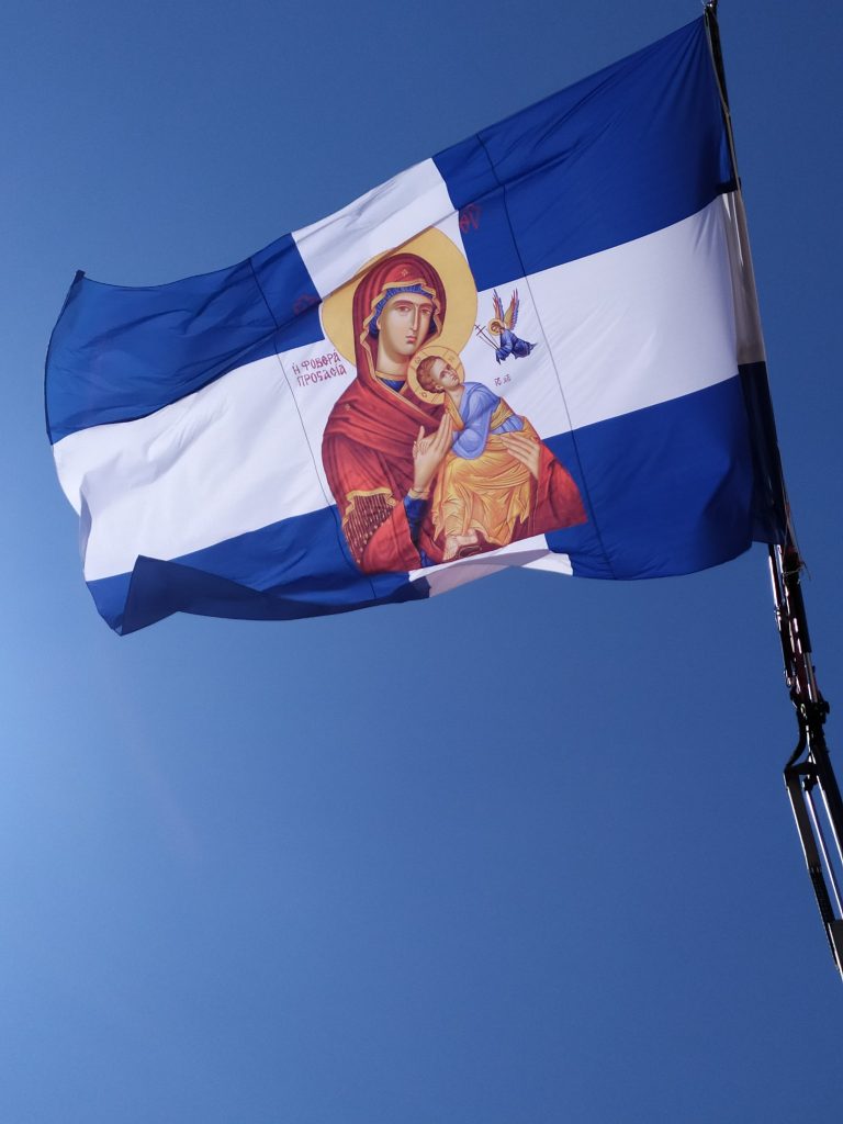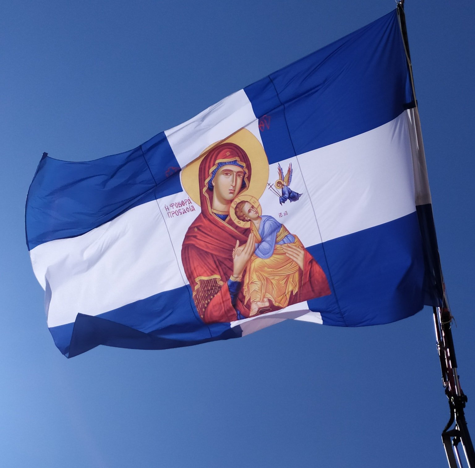 Η σημαία φέρει στην μέση την εικόνα της Παναγίας κρατώντας τον Χριστό.