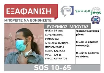 Είναι ο Ευθύμιος Μπουγάς 39 χρόνων, που έφυγε από το σπίτι του στην περιοχή της Αγίας Βαρβάρας στον Πύργο Ηλείας την Τετάρτη 4 Μαΐου και έκτοτε αγνοείται.