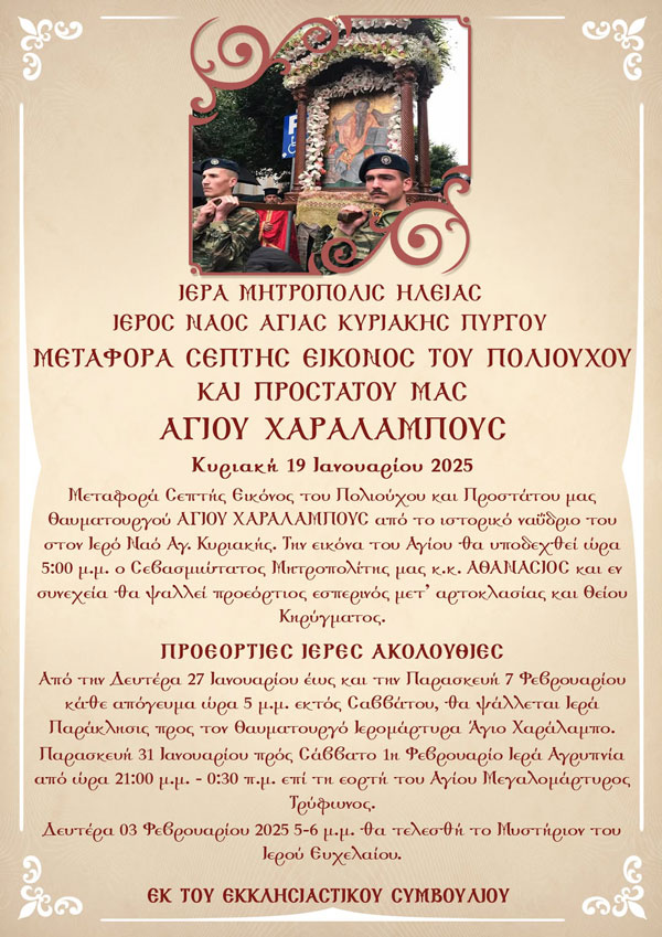 Την Κυριακή 19/1 θα πραγματοποιηθεί η μεταφορά της σεπτής εικόνας του πολιούχου του Πύργου Αγίου Χαραλάμπους από το ιστορικό ναΰδριο του στον Ι.Ν. Αγ.Κυριακής.