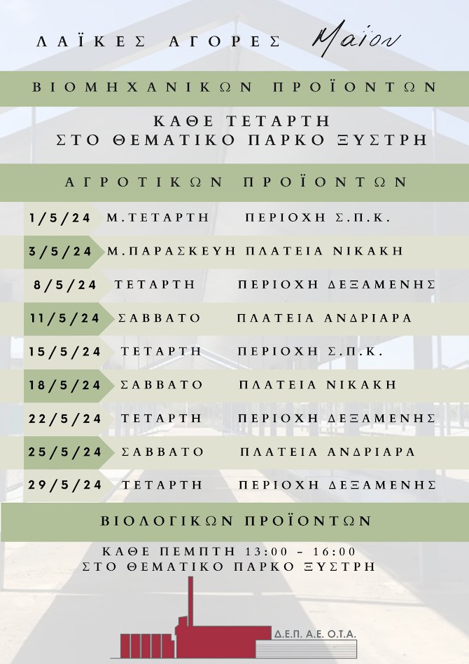 Διευκρινίζεται πως η Λαϊκή Αγορά Βιομηχανικών Προϊόντων θα διεξάγεται κάθε Τετάρτη στο χώρο του πάρκου Ξυστρή, ενώ η Αγορά Βιολογικών Προϊόντων θα συνεχίσει να διεξάγεται στο χώρο του πάρκου κάθε Πέμπτη μεσημέρι (1.00 έως 4.00 μμ).