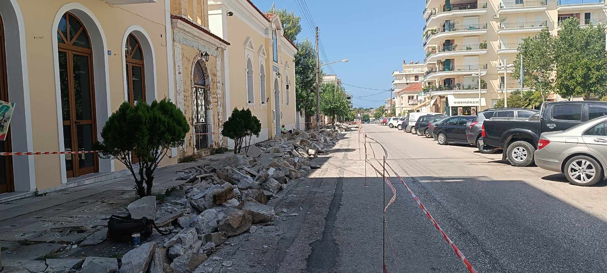 κεντρικά σημεία του Πύργου. Ήδη τα μηχανήματα ξεκίνησαν το τμηματικό σπάσιμο των παλιών πεζοδρομίων από το ύψος του 2 ου Δημοτικού σχολείου μέχρι και τη συμβολή με την οδό