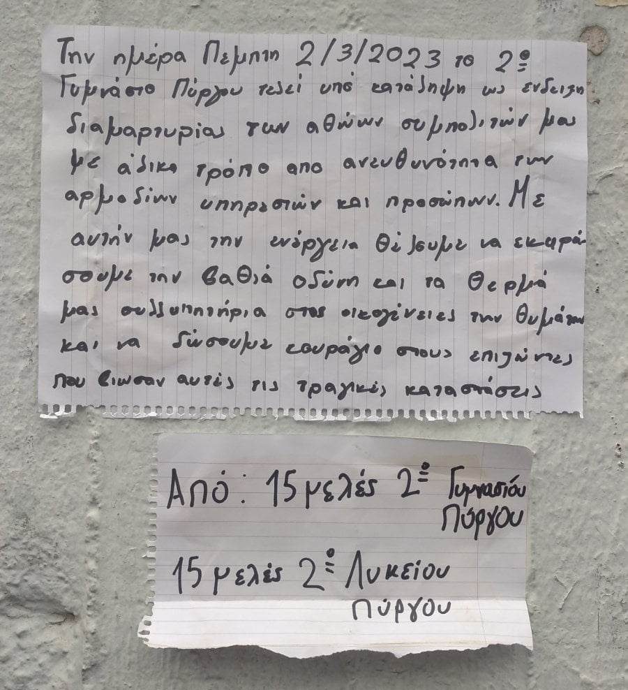 Υπό κατάληψη είναι σήμερα Πέμπτη το 2ο Γυμνάσιο και Λύκειο Πύργου ως ένδειξη διαμαρτυρίας για την μεγάλη τραγωδία των Τεμπών. Όπως αναφέρουν σε ανακοίνωσή τους που αναρτήθηκε έξω από το σχολείο, τα δύο 15μελή συμβούλια των μαθητών αποφάσισαν να κάνουν κατάληψη για να εκφράσουν προς κάθε αρμόδιο τον αποτροπιασμό τους για τις τραγικές ελλείψεις που οδήγησαν στο δυστύχημα.