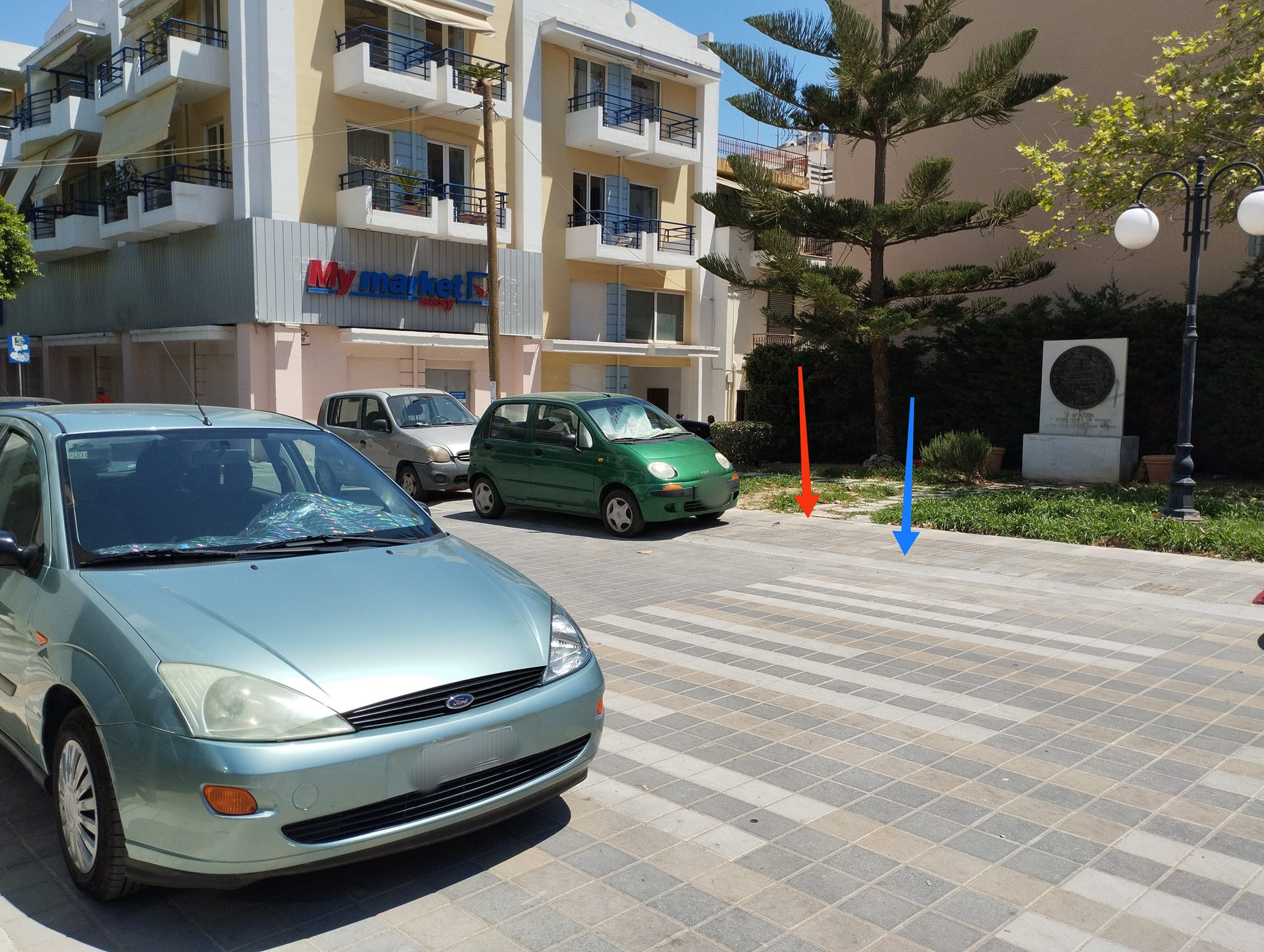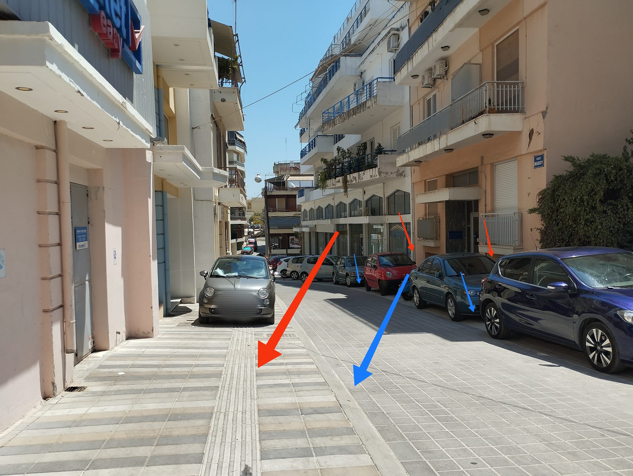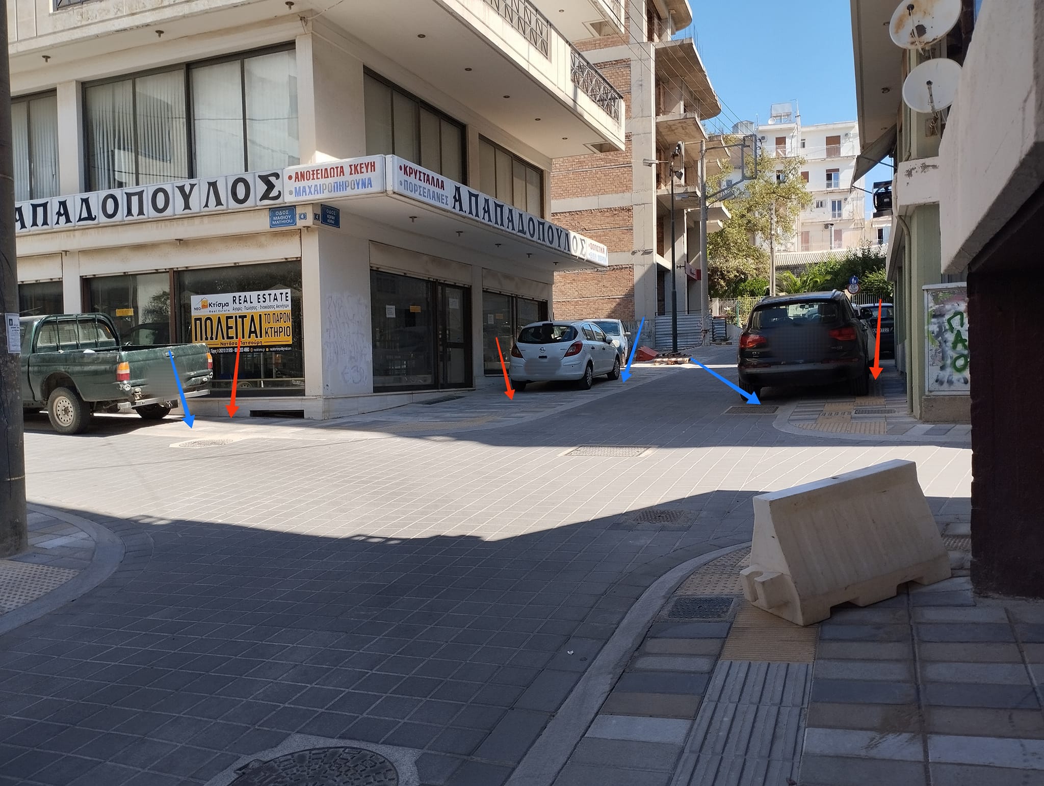 Σημείωση: στις φωτογραφίες, με γαλάζιο βέλος, επισημαίνεται το όριο των πεζοδρομίων, και με κόκκινο βέλος, η διέλευση των ΑΜΕΑ.