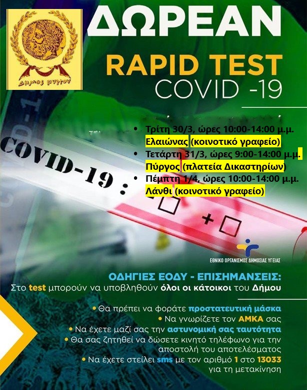 * Την Τετάρτη 31/3 και ώρες 09:00 – 14:00 θα διεξαχθούν rapid test ελέγχου για τον covid-19 σε συνεργασία με τον ΕΟΔΥ, στον Πύργο στην Πλατεία Δικαστηρίων.