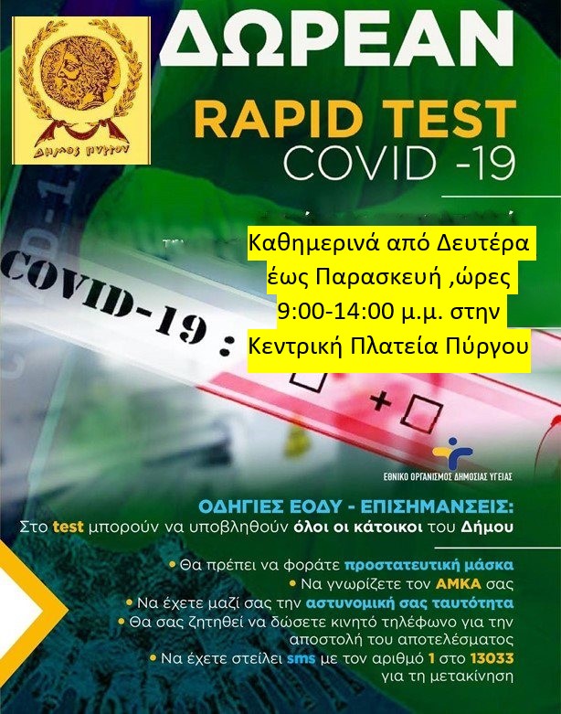 Rapid test στον Πύργο από Τρίτη έως Παρασκευή