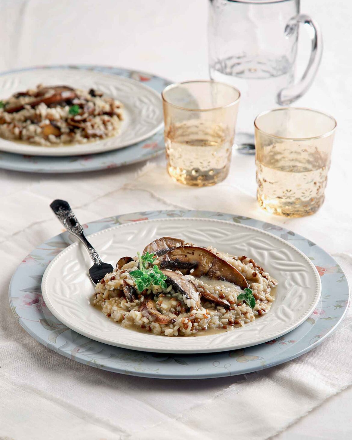 - Η διαδικασία διαρκεί περίπου 20 λεπτά, μέχρι το ριζότο να χυλώσει και οι κόκκοι του ρυζιού να μαλακώσουν μεν, αλλά να κρατάνε στο δόντι. Αποσύρουμε από τη φωτιά, ρίχνουμε τις φακές, το δεντρολίβανο, τα μανιτάρια και την παρμεζάνα, ανακατεύουμε και σκεπάζουμε την κατσαρόλα.