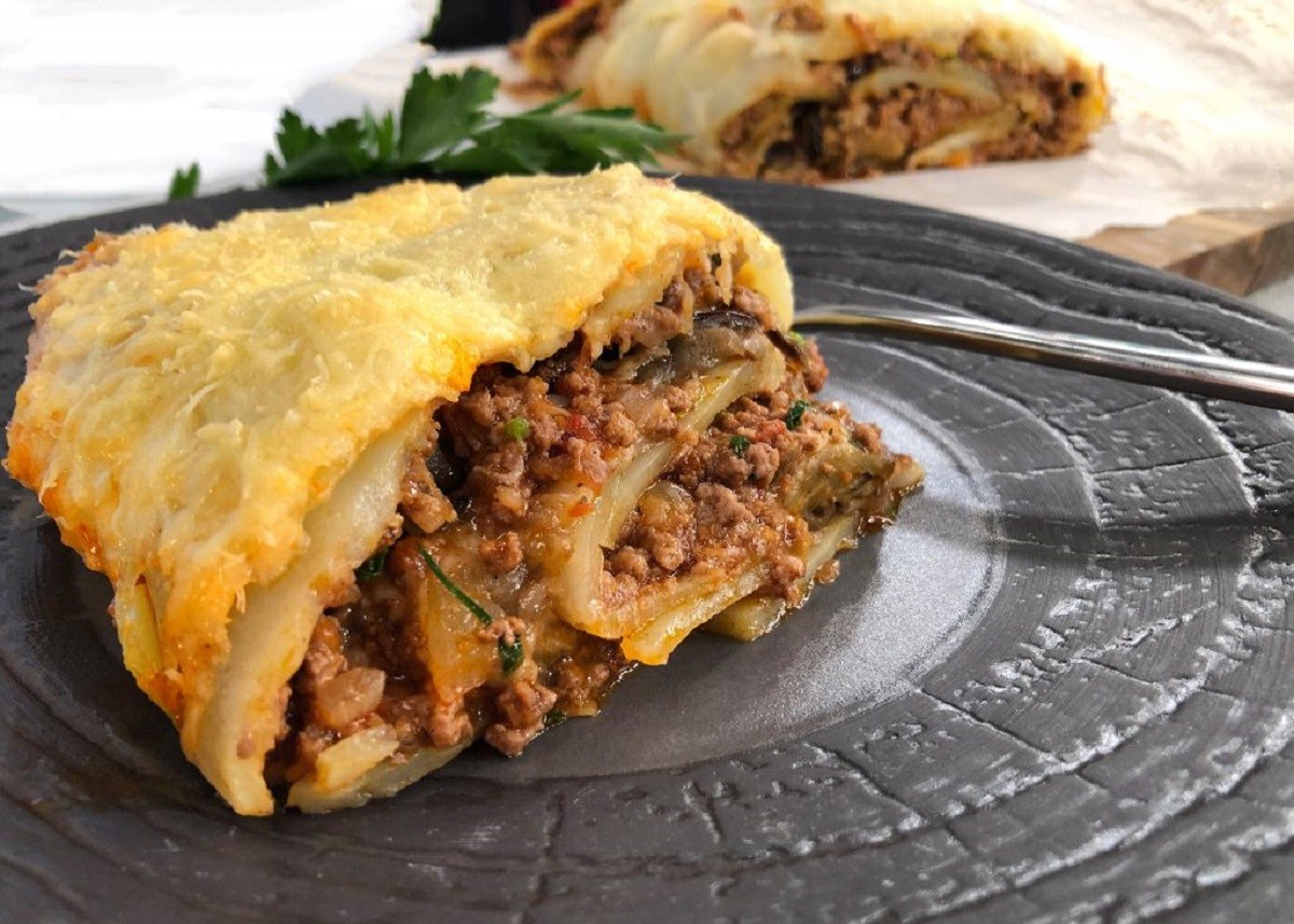 Με γέμιση σαν μουσακά, αυτή η πίτα απογειώνεται γευστικά χάρη στη Μπεσαμέλ ΓΙΩΤΗΣ. Αν θέλετε, εκτός από ρολό μπορείτε να τη φτιάξετε και σε στρογγυλό ή μακρόστενο ταψάκι.