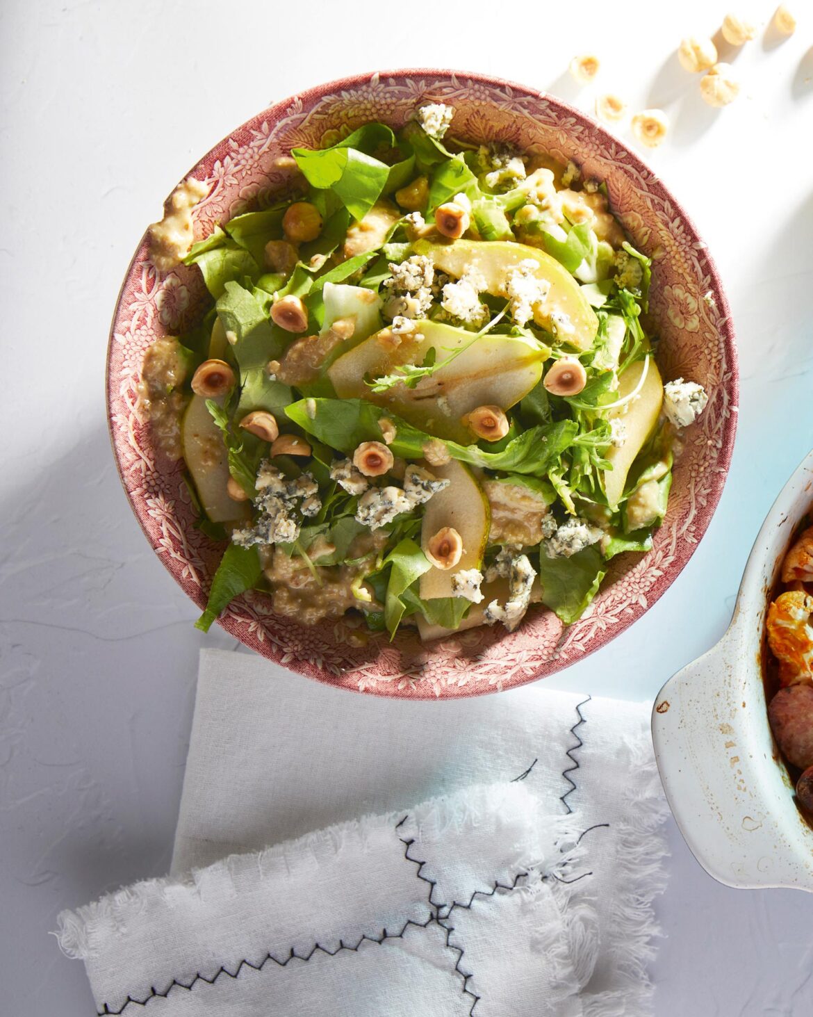 - Σκορπίζουμε τα φουντούκια, το ροκφόρ, τα αχλάδια με το ζουμί τους, ανακατεύουμε απαλά και σερβίρουμε τη σαλάτα με αχλάδια και ροκφόρ.