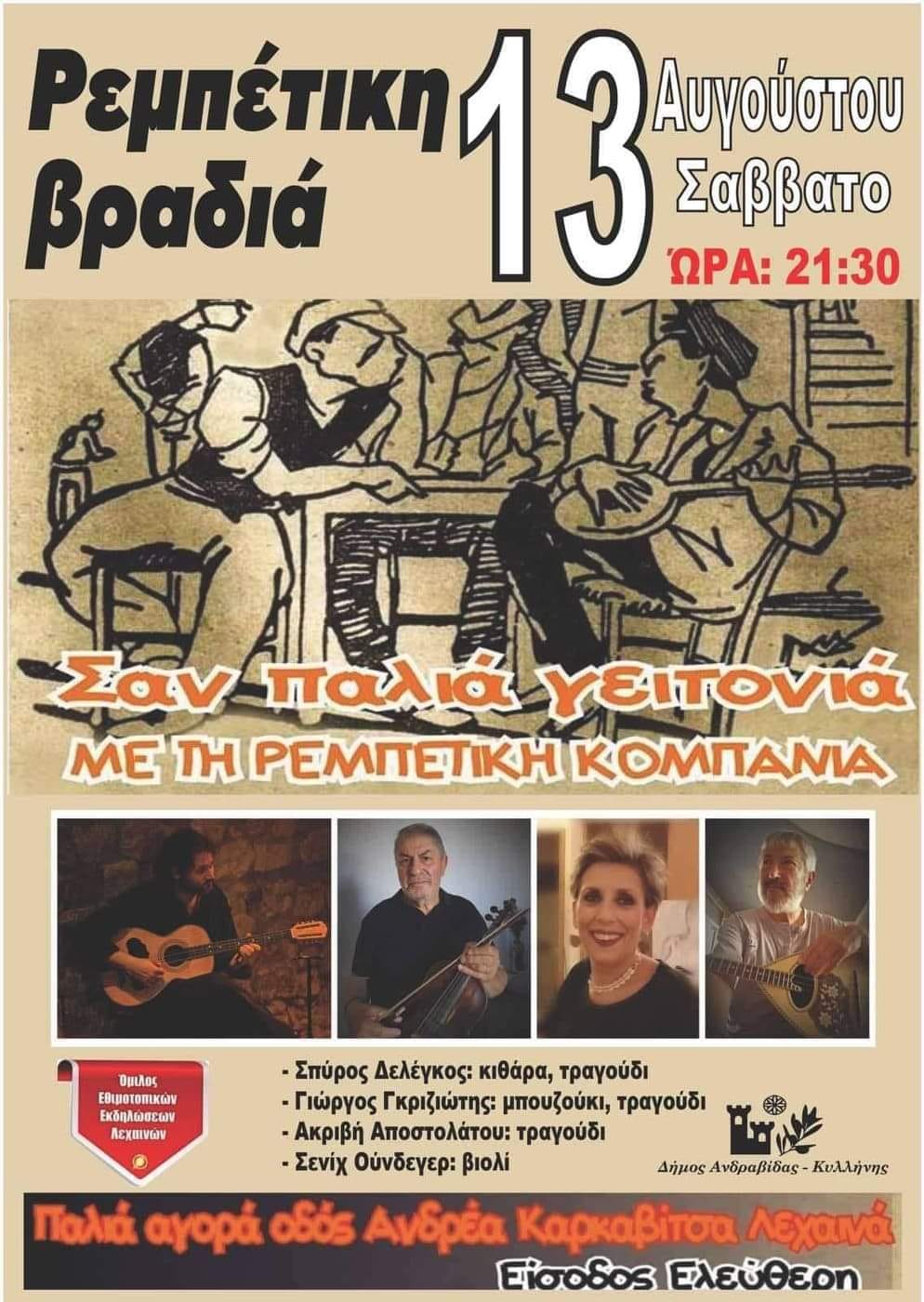Η μεγάλη ποικιλία του ρεπερτορίου της ρεμπέτικης κομπανίας, σε συνδυασμό με την άρτια εκτέλεση των τραγουδιών από δεξιοτέχνες μουσικούς, αποτελεί εγγύηση για μία όμορφη βραδιά, αναβιώνοντας γνωστά και αγαπημένα τραγούδια. Θα είναι όλοι εκεί. Ο Βαμβακάρης, ο Τσιτσάνης, ο Παπαϊωάννου, η Ρόζα Εσκεναζυ η Μαρίκα Νίνου, η Μπελου . Τα τραγούδια αυτά σύντροφεψαν όλη την Ελλάδα.
