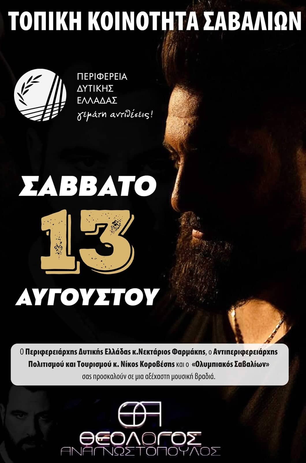 Έτσι, το Σάββατο το βράδυ στα Σαβάλια το μουσικό σχήμα του δημοφιλούς Αμαλιαδίτη τραγουδοποιού, συνθέτη και τραγουδιστή Θεολόγου Αναγνωστόπουλου, θα χαρίσει στο κοινό μια σπουδαία λαϊκή βραδιά, με ένα μεγάλο ρεπερτόριο τραγουδιών που έχουμε αγαπήσει, αλλά και με κομμάτια από την προσωπική του δισκογραφία.