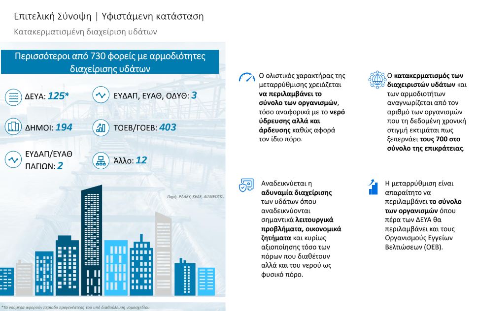 Η υφιστάμενη δομή διαχείρισης υδάτων χαρακτηρίζεται από κατακερματισμό: περισσότεροι από 730 φορείς εμπλέκονται στη διαχείριση του νερού, από ΔΕΥΑ και δήμους, μέχρι Οργανισμούς Εγγείων Βελτιώσεων (ΤΟΕΒ/ΓΟΕΒ). Η καταγραφή περιλαμβάνει 125 Δημοτικές Επιχειρήσεις ΄Υδρευσης-Αποχέτευσης, 403 ΤΟΕΒ/ΓΟΕΒ και δύο ισχυρούς φορείς την ΕΥΔΑΠ και ΕΥΑΘ. Οι αλληλοεπικαλύψεις αρμοδιοτήτων, η έλλειψη εθνικής στρατηγικής, οι καθυστερήσεις στα έργα και η αδυναμία αξιοποίησης χρηματοδοτήσεων έχουν οδηγήσει σε σοβαρά λειτουργικά και οικονομικά προβλήματα τους οργανισμούς αυτούς για αυτό και η μεταρρύθμιση προβλέπει ότι θα πρέπει να περιλαμβάνει το σύνολο των φορέων.