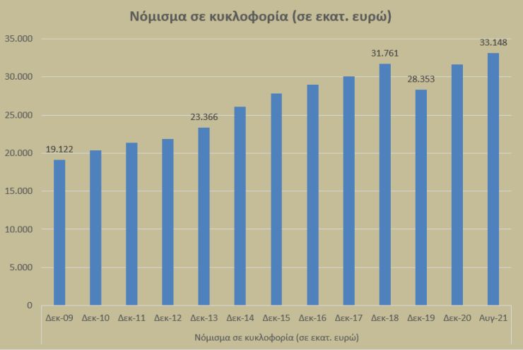 Αναλυτικότερα, σύμφωνα με τα στοιχεία της Τράπεζας της Ελλάδος, το νόμισμα σε κυκλοφορία, τον περασμένο Αύγουστο ανήλθε στο ποσό των 33,15 δισ. ευρώ, που αποτελεί και νέο ιστορικό ρεκόρ, από 3,04, που ήταν τον Ιούλιο.
