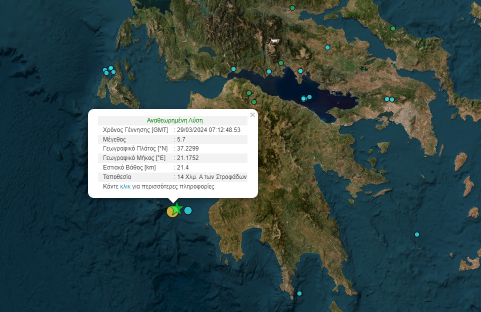 Το επίκεντρο του πρώτου σεισμού εντοπίζεται στη θαλάσσια περιοχή 16χλμ ΑΝΑ των Στροφάδων, ενώ του δεύτερου, στην ίδια περιοχή, 17 χλμ ΑΝΑ των Στροφάδων.