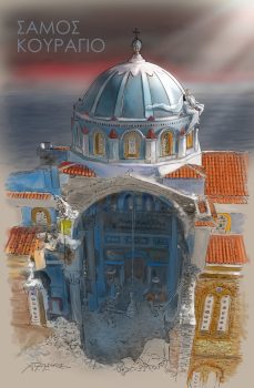 Στο σκίτσο του, ο Χρήστος Παπανίκος αποτυπώνει την εικόνα καταστροφής που επικρατεί στη Σάμο, την επόμενη μέρα. Συγκεκριμένα, απεικονίζει τις σοβαρές ζημιές που υπέστη o εμβληματικός ναός της Κοιμήσεως της Θεοτόκου στο Καρλόβασι, που είναι από τους μεγαλύτερους στα Βαλκάνια, με το μήνυμα: «Σάμος – Κουράγιο».