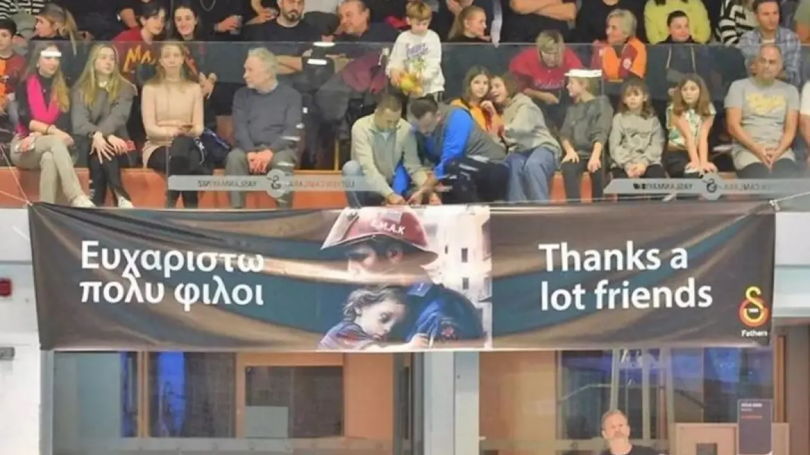 «Ευχαριστούμε πολύ φίλοι», το συγκινητικό πανό που σήκωσαν λίγο πριν από την έναρξη του 2ου Προημιτελικού του Challenger Cup στο κολυμβητήριο «Engin Bora Waterpolo Pool» της Κωνταντινούπολης οι φίλαθλοι της Γαλατασαράι και το οποίο απεικόνιζε ένα παιδάκι από την Τουρκία στην αγκαλιά ενός Έλληνα διασώστη.