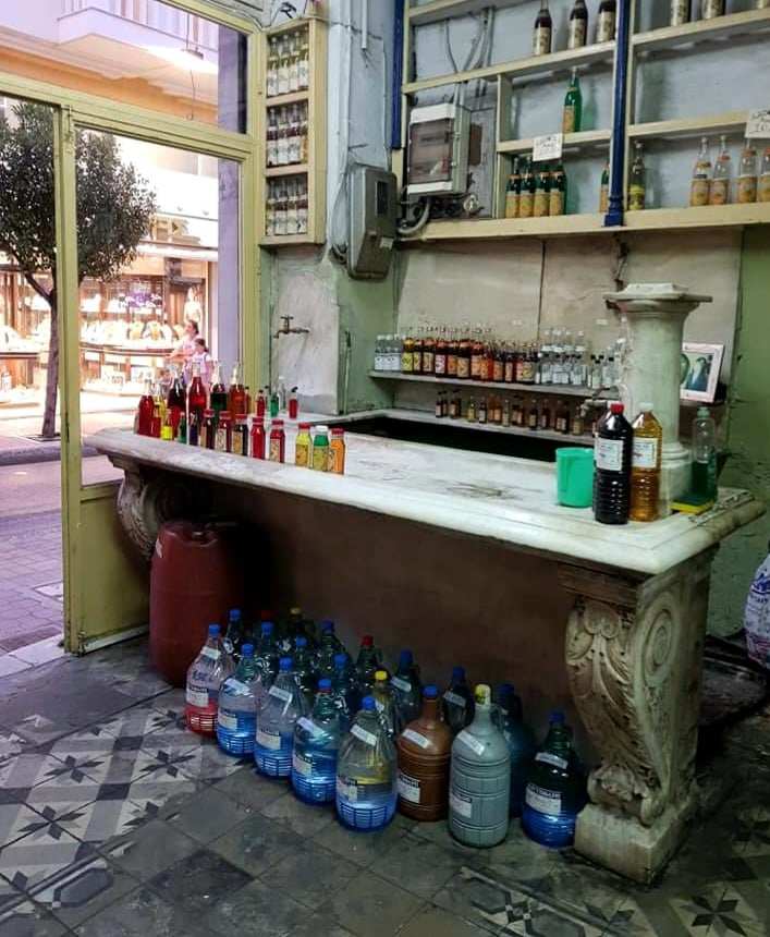 Εκείνο όμως που πραγματικά εντυπωσιάζει είναι ο μεγάλος μαρμάρινος πάγκος που βρίσκεται στην αριστερή πλευρά του εσωτερικού. Πάνω στον πάγκο είναι αραδιασμένα πολλά μπουκάλια με πολύχρωμο περιεχόμενο: μπλε, κόκκινο, κίτρινο, πράσινο, ούζο. Όλα αυτά είναι τοποθετημένα σε έναν δίσκο και συνοδεύονται από ρακοπότηρα.