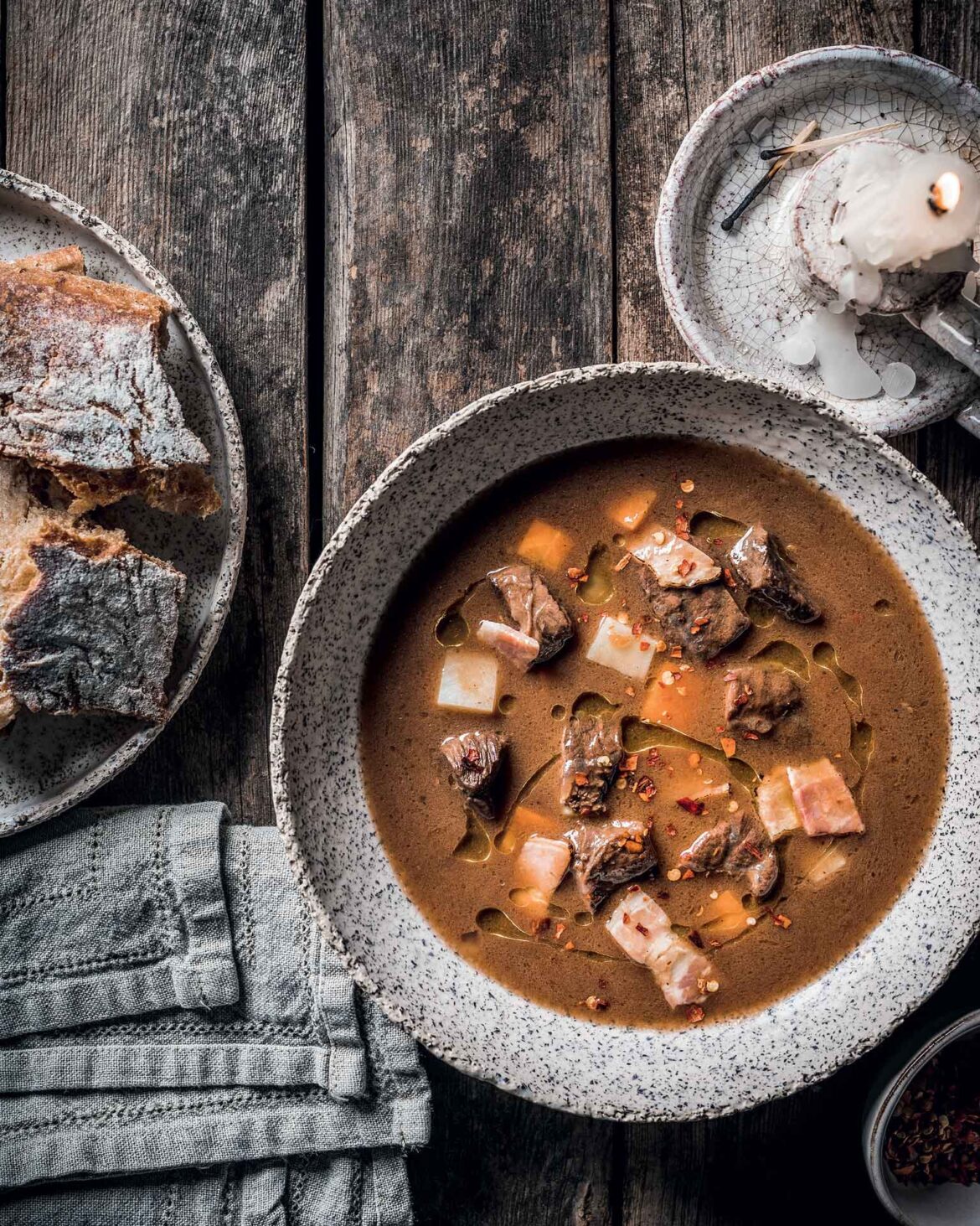 Σιγομαγειρεμένη κρεατόσουπα με οσομπούκο, μοσχαρίσια ελιά και λαχανικά