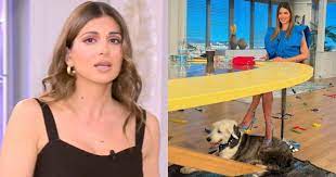 Η παρουσιάστρια ποζάρει στο πλατό της εκπομπής, ακουμπώντας με το ψηλό της τακούνι πάνω στον σκύλο.