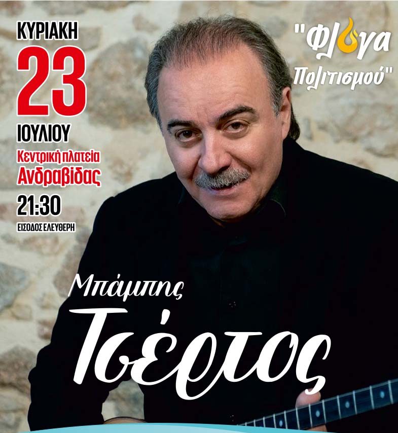Η πόλη της Ανδραβίδας, θα είναι ο επόμενος σταθμός της «Φλόγας Πολιτισμού 2023» όπου την Κυριακή 23 Ιουλίου, στις 9.30 το βράδυ, ο τομέας Πολιτισμού της Περιφέρειας Δυτικής Ελλάδας παρουσιάζει με ελεύθερη όπως πάντα είσοδο για το κοινό, μια μοναδική μουσική βραδιά με τον αγαπημένο Μπάμπη Τσέρτο, στην κεντρική πλατεία της Ανδραβίδας. Ο Μπάμπης Τσέρτος θα παρουσιάσει ένα πρόγραμμα “εφ- όλης της ύλης”, γεμάτο με τα ωραιότερα τραγούδια του Ελληνικού
