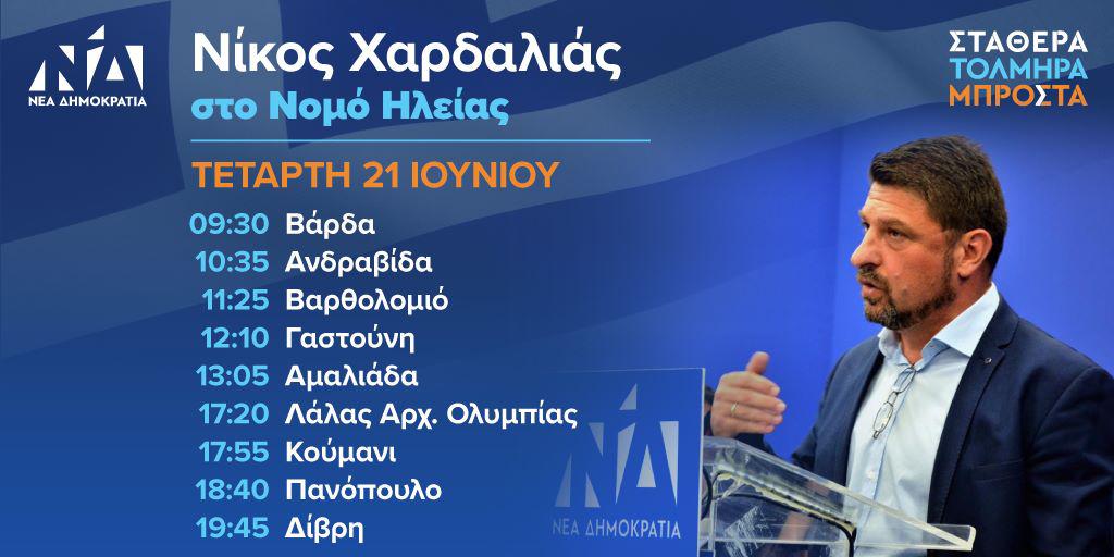 Στην Ηλεία έρχεται επίσκεψη αύριο Τετάρτη ο Νίκος Χαρδαλιάς, πρώην υπουργός της ΝΔ και θα επισκεφθεί πολλές περιοχές σε μια περιοδεία λίγο πριν τις κάλπες της 25ης Μαΐου.