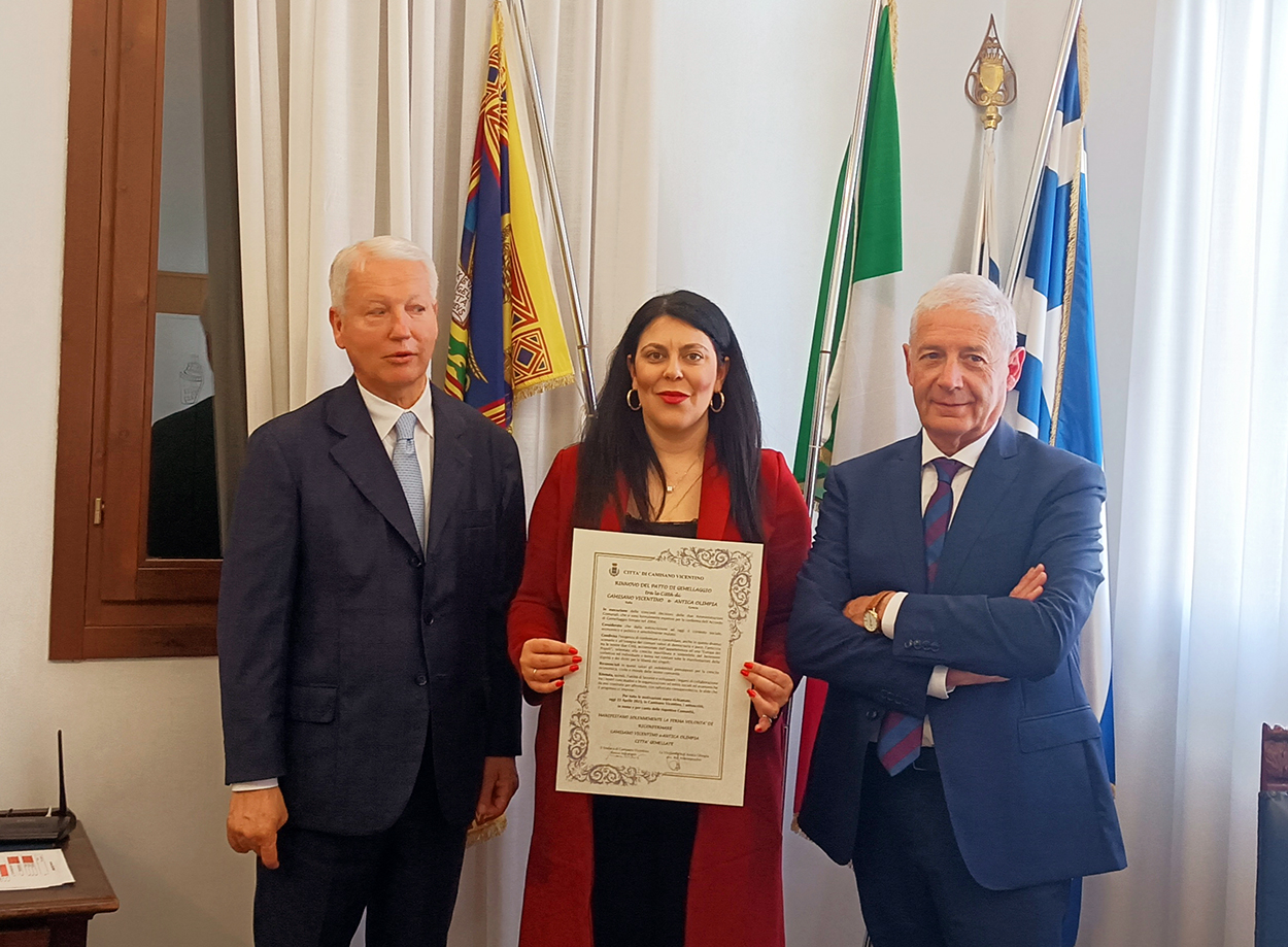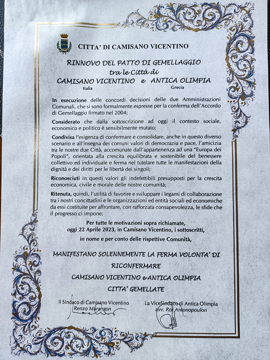 Πραγματοποιήθηκε το Σάββατο 22 Απριλίου στην ιταλική πόλη Camisano Vicentino εκδήλωση επιβεβαίωσης της αδελφοποίησης της πόλης με τον Δήμο Αρχαίας Ολυμπίας, μια σχέση που μετρά σχεδόν εικοσαετία.
