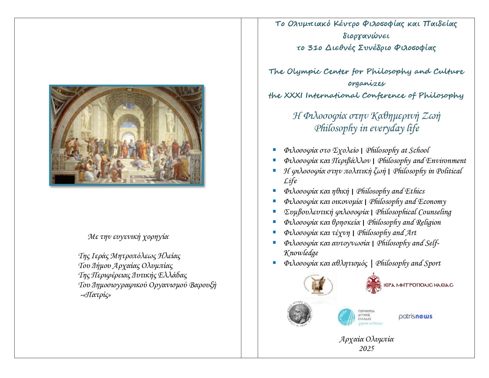 Ο Δήμος Αρχαίας Ολυμπίας και το Ολυμπιακό Κέντρο Φιλοσοφίας και Παιδείας σας προσκαλούν στο 31ο Διεθνές Συνέδριο Φιλοσοφίας με θέμα «Η Φιλοσοφία στην Καθημερινή Ζωή» που πραγματοποιείται στην Αρχαία Ολυμπία (Δημαρχείο) σε συνεργασία με την Ιερά Μητρόπολη Ηλείας, τον Δήμο Αρχαίας Ολυμπίας, Την Περιφέρεια Δυτικής Ελλάδας και τον Δημοσιογραφικό Οργανισμό Βαρουξή-«Πατρίς», το διήμερο 6-7 Δεκεμβρίου 2025.