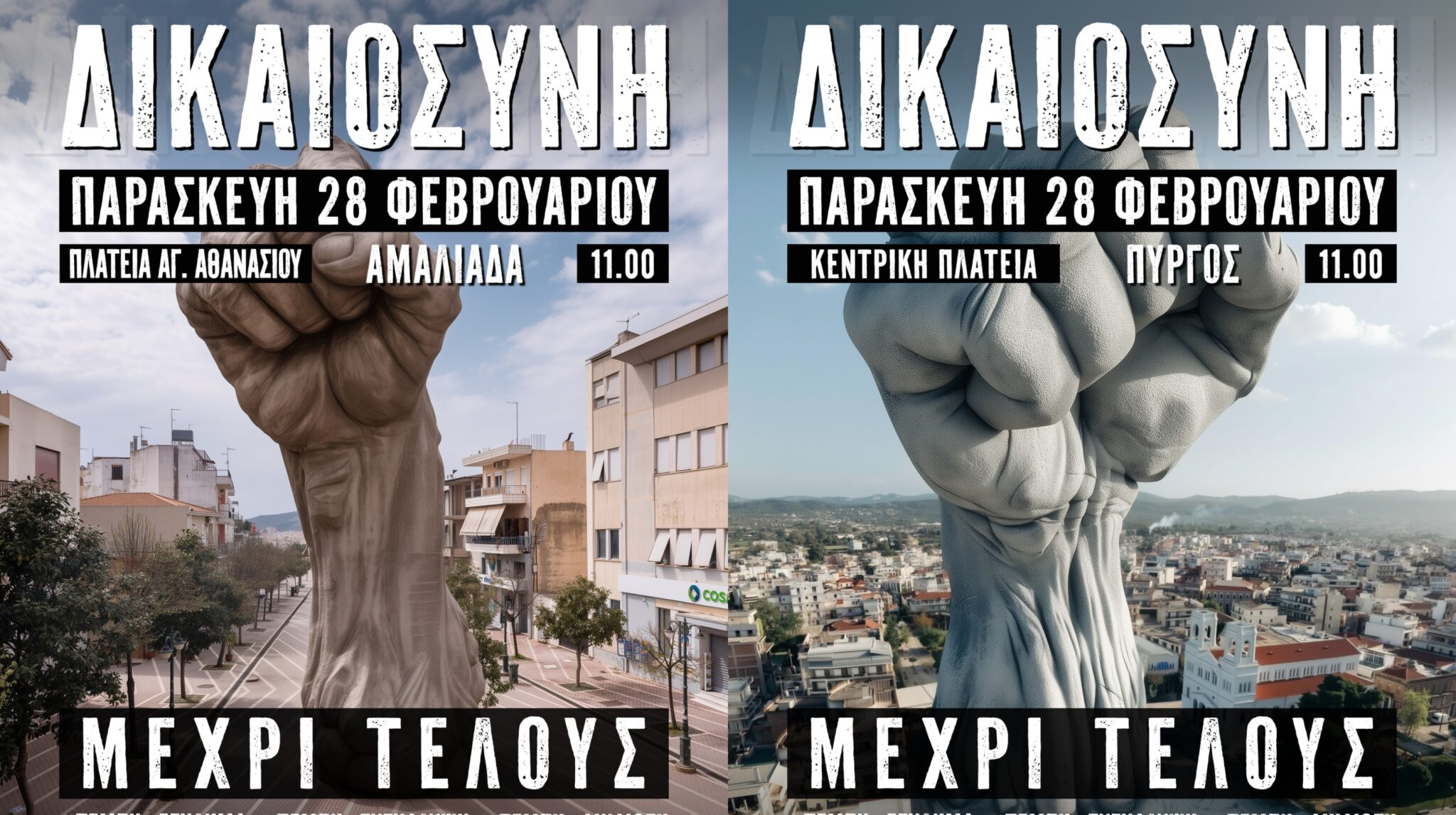 Στον Πύργο και την Αμαλιάδα, όπως και σε όλη την Ελλάδα, προγραμματίζονται συγκεντρώσεις για την τραγωδία με τους 57 νεκρούς στα Τέμπη την Παρασκευή 28 Φεβρουαρίου, στις 11:00 π.μ., με κεντρικό σύνθημα: