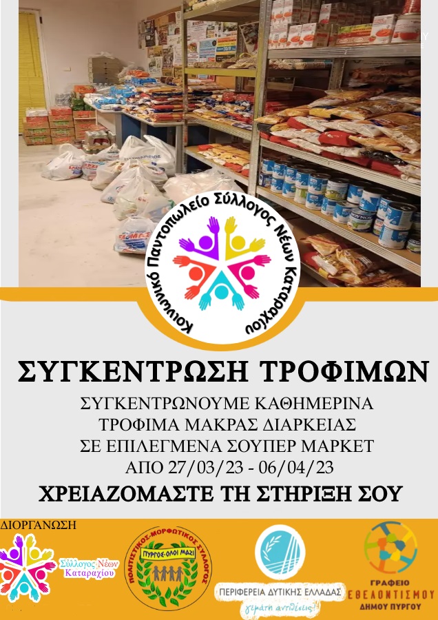 Συγκέντρωση τροφίμων από το Σύλλογο Νέων Καταραχιου και το Σύλλογο Πύργος Όλοι Μαζί, σε συνεργασία με την Περιφέρεια Δυτικής Ελλάδος και το Γραφείο Εθελοντισμού του Δήμου Πύργου.