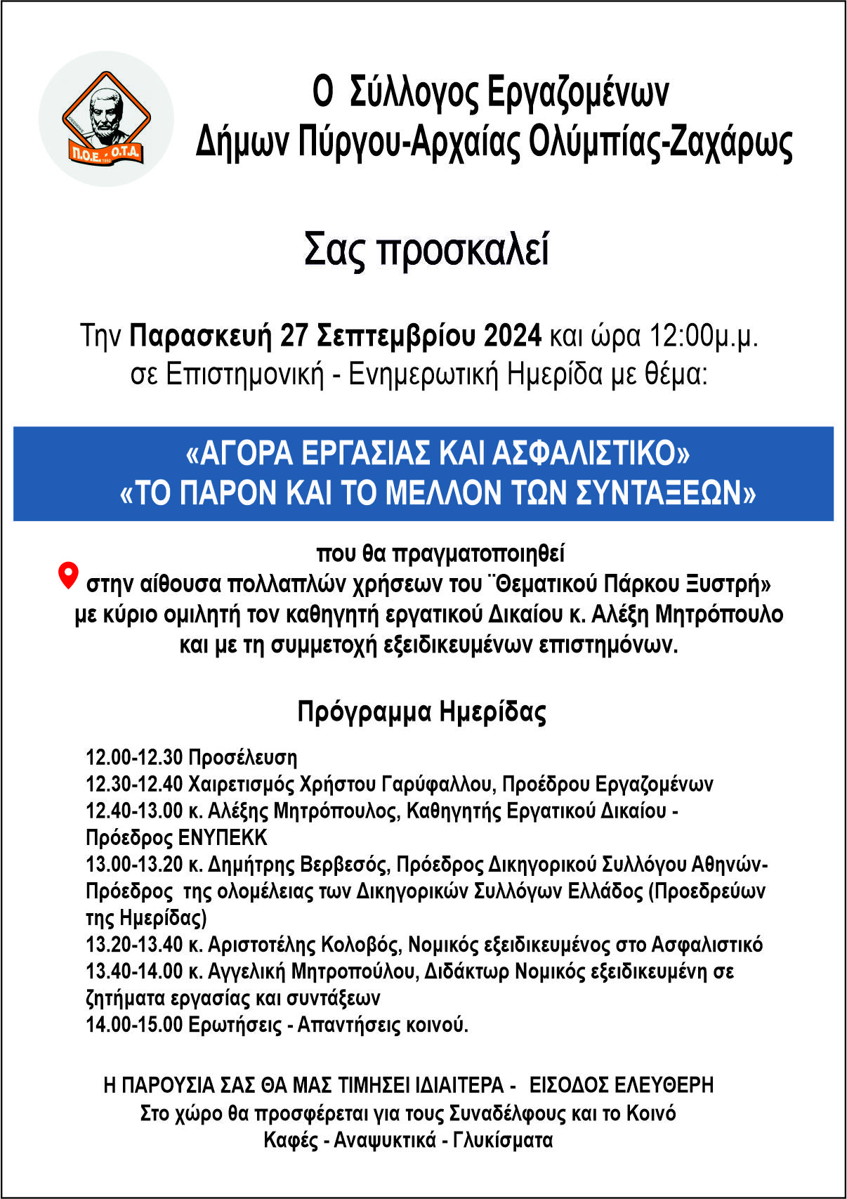 Όπως τονίζει ο πρόεδρος του Συλλόγου Εργαζομένων Πύργου- Ολυμπίας- Ζαχάρως «Η Ημερίδα απευθύνεται σε όλους τούς εργαζόμενους και συνταξιούχους του Δημοσίου και Ιδιωτικού Τομέα, που τούς απασχολούν πολλά από τα κάτωθι ερωτήματα: