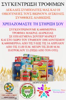 Έτσι και φέτος, όπως κάθε χρόνο, ο Σύλλογος Νέων Καταραχίου, σε συνεργασία με το Γραφείο Εθελοντισμού του Δήμου Πύργου και το σύλλογο Πύργος Όλοι Μαζί, συγκεντρώνει τρόφιμα μακράς διαρκείας για άπορες οικογένειες, ώστε φέτος το Πάσχα να γίνουμε όλοι μια αλυσίδα αγάπης για όλους τους συνανθρώπους μας!