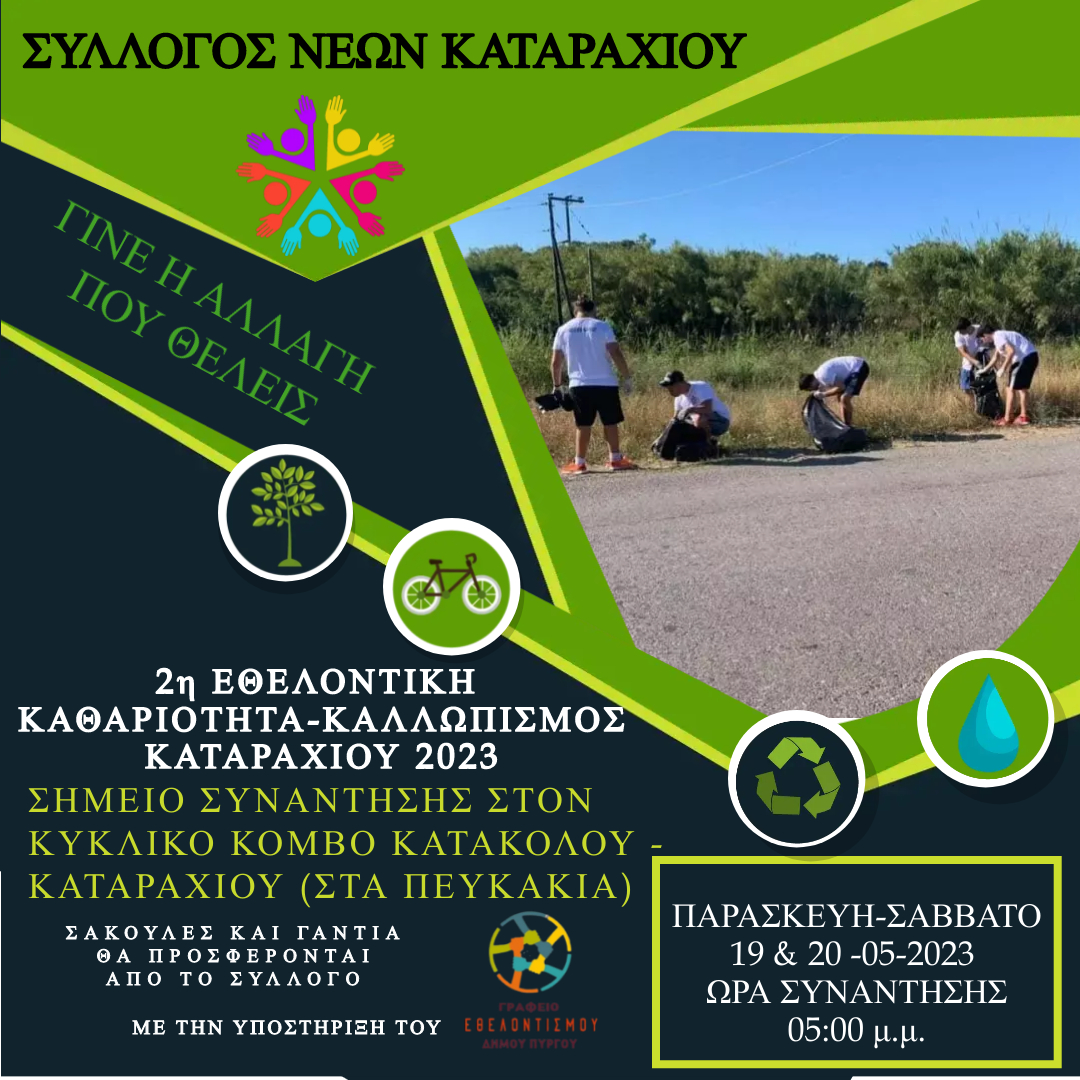 Με σύνθημα «βάλε κι εσύ ένα χεράκι», ο Σύλλογος μας απευθύνει κάλεσμα σε όλους τους πολίτες και συλλόγους του δήμου Πύργου για μαζική ενεργοποίηση και συμμετοχή στην Εθελοντική Καθαριότητα της περιοχής και γειτονιών του Καταραχίου. Συναντιόμαστε στον κόμβο Κατακόλου Καταραχίου