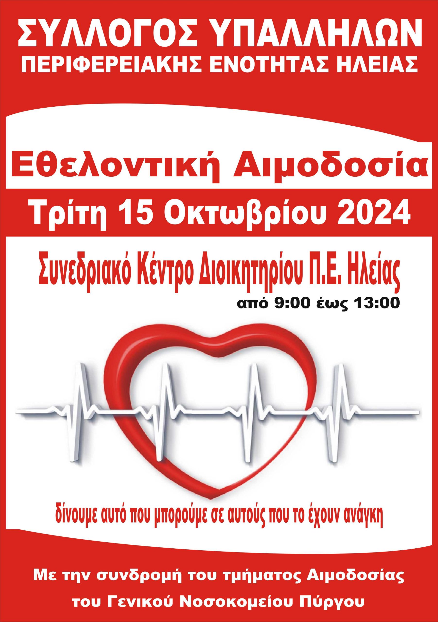 Ο Σύλλογός Υπαλλήλων Περιφερειακής Ενότητας Ηλείας, την Τρίτη 15 Οκτωβρίου 2024 διοργανώνει Εθελοντική Αιμοδοσία για την ενίσχυση της Τράπεζας Αίματος.
