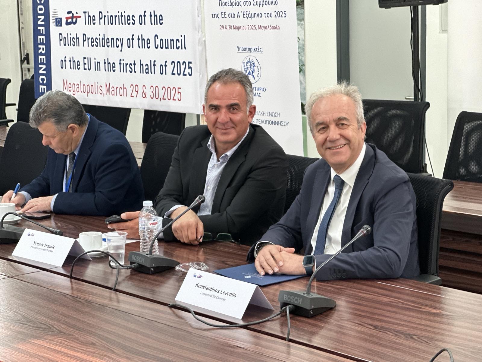 Την ανάγκη για προστασία της ασφάλειας και της ελευθερίας των ευρωπαϊκών επιχειρήσεων επισήμανε ο Προέδρος του Επιμελητηρίου Ηλείας, κ. Κωνσταντίνος Λεβέντης, στην συνδιάσκεψη με θέμα «Οι Προτεραιότητες της Πολωνικής Προεδρίας στο Συμβούλιο της ΕΕ», ενώ ζήτησε από την Πολιτεία να παρέμβει για το θέμα των δανείων προς τις επιχειρήσεις της Πελοποννήσου, μετά τις πυρκαγιές του 2007.