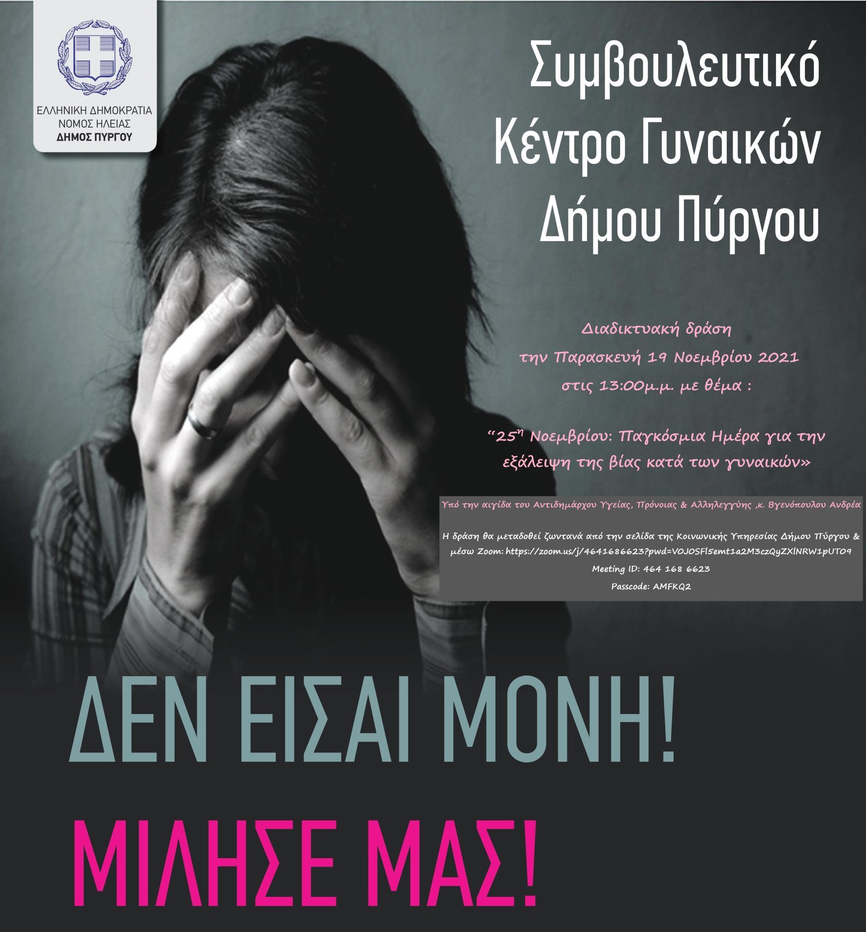 Διαδικτυακή Δράση την Παρασκευή 19 Νοεμβρίου, στις 13.00, με θέμα: “25 Νοεμβρίου: Παγκόσμια Ημέρα για την Εξάλειψη της Βίας κατά των Γυναικών”