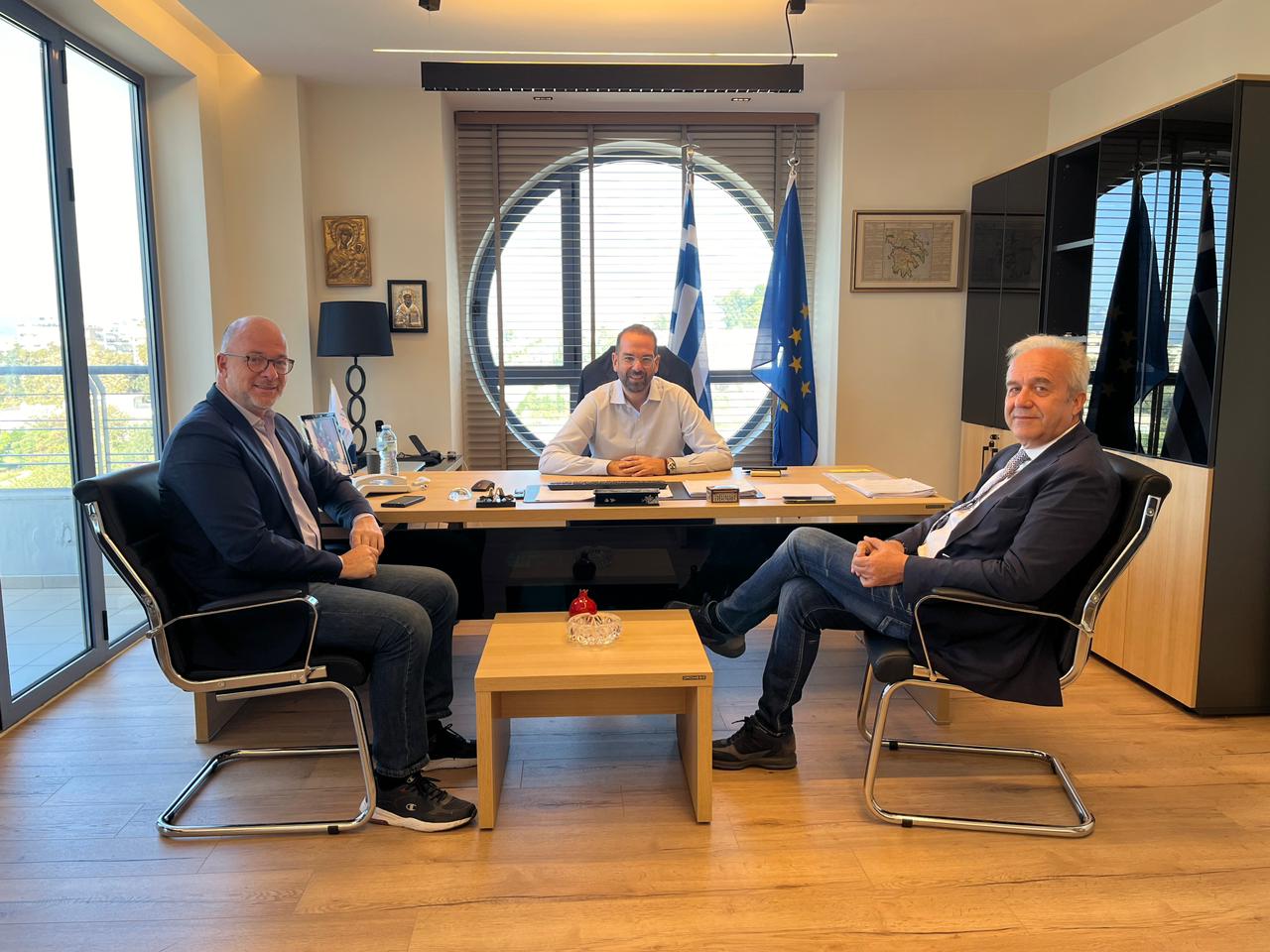 Ο Κωνσταντίνος Λεβέντης, υποψήφιος Πρόεδρος του Επιμελητηρίου Ηλείας με την Παράταξη «Οι Επιχειρήσεις Μπροστά», επισκέφθηκε την Τρίτη 29 Οκτωβρίου 2024 τα γραφεία της Περιφέρειας Δυτικής Ελλάδας στην Πάτρα, όπου συναντήθηκε με τον Περιφερειάρχη κ. Νεκτάριο Φαρμάκη και στη συνέχεια με τον Αντιπεριφερειάρχη Επιχειρηματικότητας, Έρευνας και Καινοτομίας, κ. Τάκη Παπαδόπουλο.