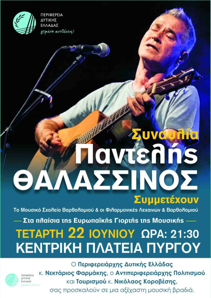 Στο πλαίσιο της Ευρωπαϊκής Γιορτής της Μουσικής, πραγματοποιείται στον Πύργο την Τετάρτη 22 Ιουνίου στην κεντρική πλατεία (21.30), συναυλία με τον ξεχωριστό συνθέτη και τραγουδιστή Παντελή Θαλασσινό, καθώς και το Μουσικό Σχολείο Βαρθολομιού και τις Φιλαρμονικές Ορχήστρες Λεχαινών και Βαρθολομιού, την οποία διοργανώνει η Περιφέρεια Δυτικής Ελλάδας.
