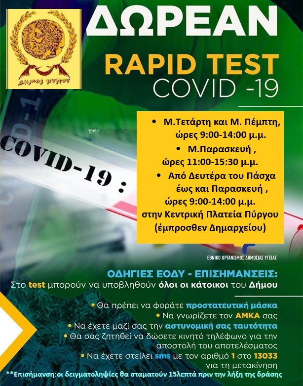 Συνεχίζεται η διεξαγωγή rapid test στην Κεντρική Πλατεία Πύργου