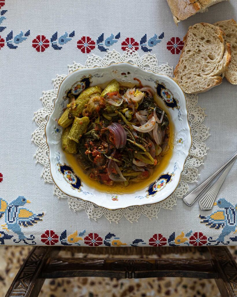 Κατσίκι με κολοκυθοκορφάδες φρικασέ, δεμένο με καρότο