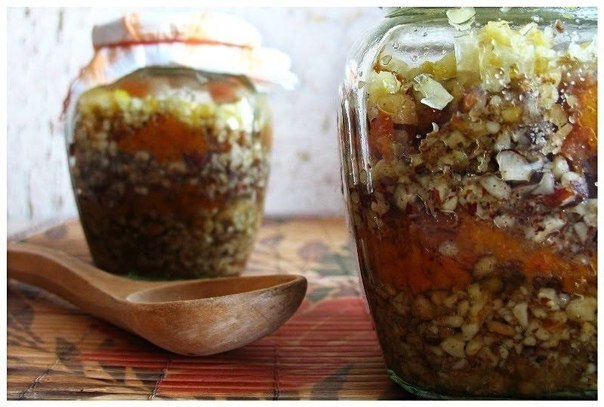 Πρώτα απ ‘όλα, πολτοποιήστε όλα τα υλικά σε μια μηχανή κοπής κιμά, ή μπορείτε να τα ψιλοκόψετε και να τα αναμίξετε καλά. Στη συνέχεια, προσθέτετε το μέλι και ανακατεύετε πολύ καλά. Στο τέλος, αποθηκεύστε το μείγμα σε ένα βάζο.