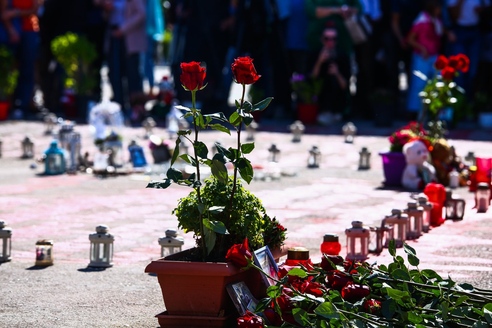 Λίγα λεπτά μετά τη λήξη της μαθητικής παρέλασης στο Σύνταγμα, πλήθος κόσμου απέτισε φόρο τιμής στο μνημείο των θυμάτων των Τεμπών, αφήνοντας λουλούδια.