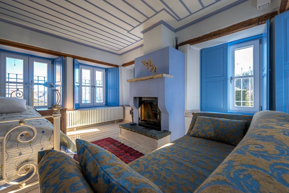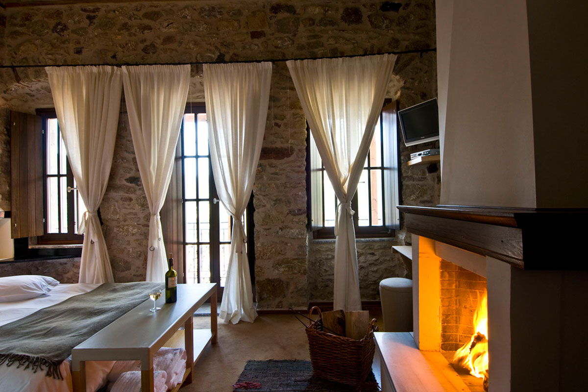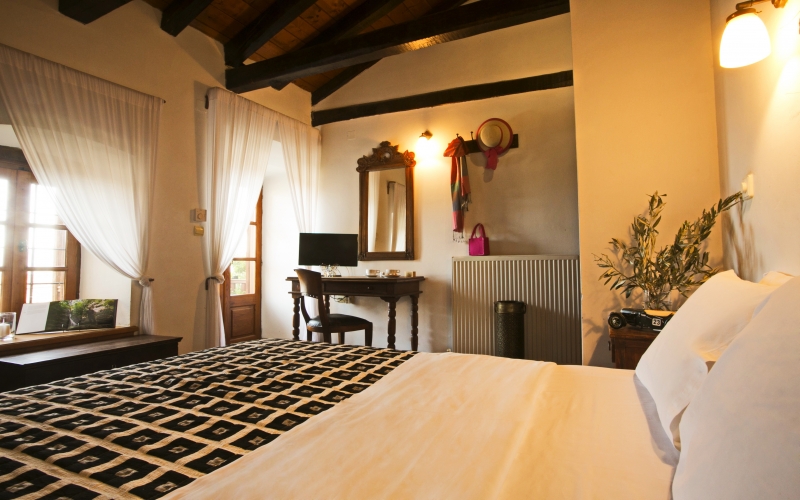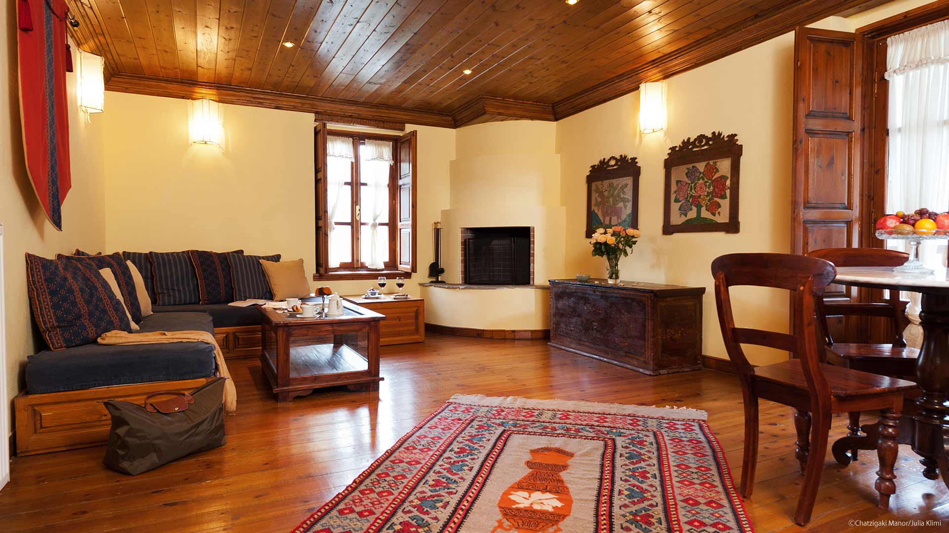 Μεγάλα, ψηλοτάβανα δωμάτια και σουίτες με αρχοντιά και κομψότητα, πανέμορφες ξύλινες οροφές, χειροποίητα χαλιά, έπιπλα αντίκες, υπέροχοι καθρέφτες, αρμονικός συνδυασμός ξύλου και πέτρας.