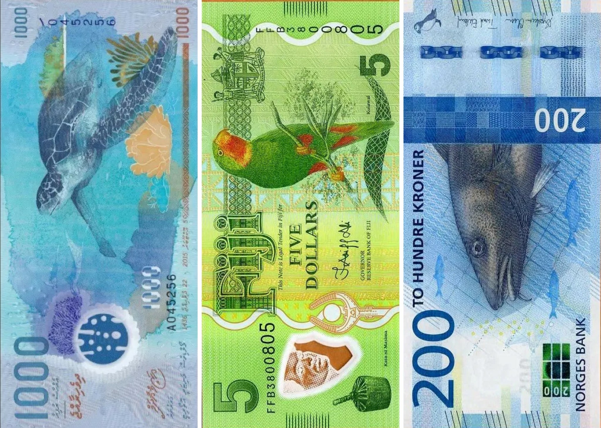 Σε φόντο γαλάζιο και μ’ ένα μεγάλο κεφάλι μπακαλιάρου να προβάλλει μπροστά στα μάτια του κατόχου, η Νορβηγία τίμησε τη μεγάλη ψαράδικη παράδοσή της σ’ αυτή τη σειρά χαρτονομισμάτων, που κυκλοφόρησε το 2016. Ο μπακαλιάρος κλέβει την παράσταση, βέβαια, αλλά στο φόντο διακρίνουμε και ρέγγες (ένα ακόμη χαρακτηριστικό θαλασσινό προϊόν των τοπικών θαλασσών) και στην πάνω δεξιά γωνία ένα puffin, είδος θαλάσσιου πτηνού, το οποίο τρέφεται αποκλειστικά με ψάρια. Οι 200 κορώνες αντιστοιχούν σε 17 ευρώ.
