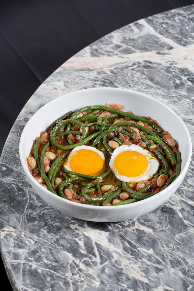 Ταυτόχρονα σε ένα τηγάνι ετοιμάζουμε τα αυγά. Όταν τηγανιστούν, σερβίρουμε πρώτα τα φασόλια και από πάνω βάζουμε δύο αυγά σε κάθε πιάτο.