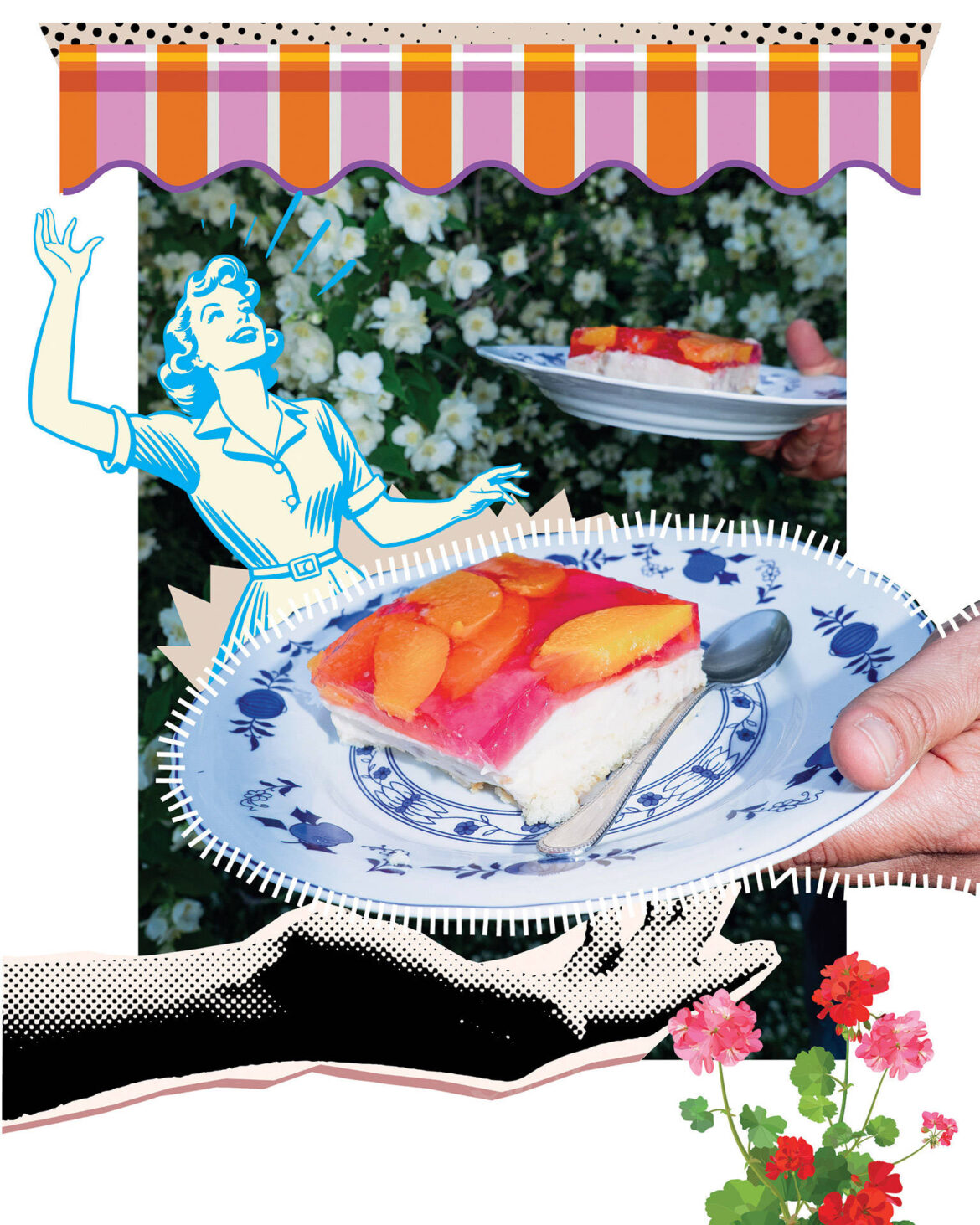 Γλυκό ψυγείου με κρέμα βανίλια, ζελέ φράουλα και κομπόστα ροδάκινο