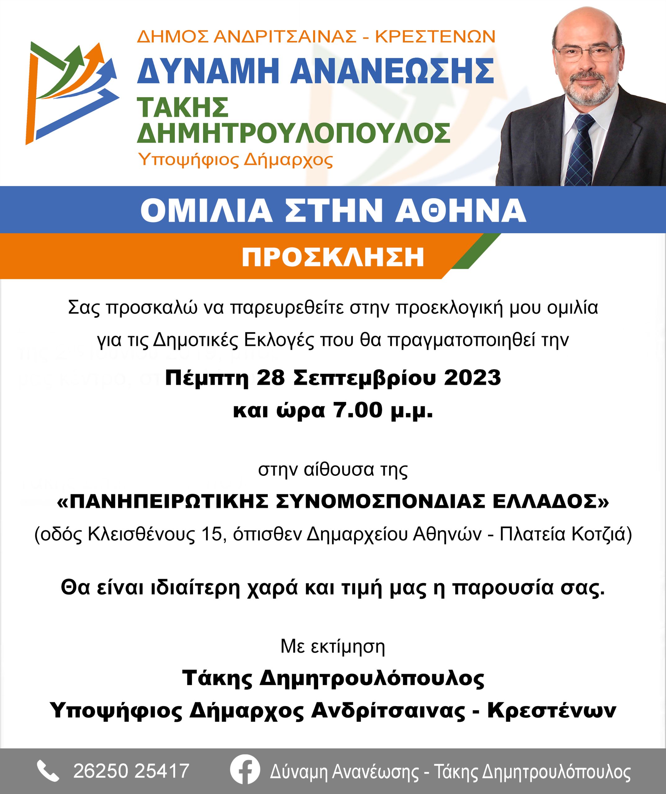 Τάκης Δημητρουλόπουλος: Ομιλία στην Αθήνα την Πέμπτη 28/9