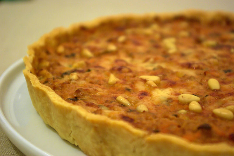 Αδειάζουμε το μείγμα στην τάρτα και ψήνουμε σε προθερμασμένο φούρνο στους 200°C για 20΄-25΄ μέχρι να αποκτήσει ένα ωραίο χρυσαφένιο χρώμα.