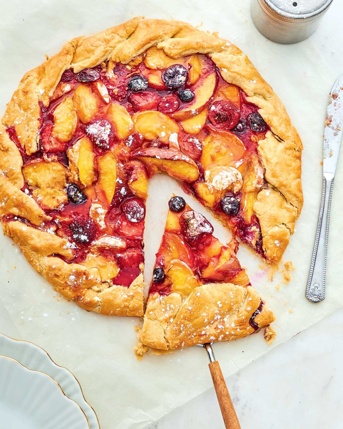 - Φέρνουμε το περιθώριο του φύλλου περιμετρικά προς τα μέσα, καλύπτοντας πρόχειρα τη γέμιση γύρω γύρω. Θα φτιάξουμε δηλαδή ένα στεφάνι ζύμης περιφερειακά, ενώ στο κέντρο τα φρούτα θα είναι εκτεθειμένα.