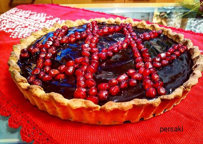 Αδειάζετε την κρέμα πάνω από τη ζύμη και σκορπίζετε τους σπόρους ροδιού, πιέζοντας λίγο με τη σπάτουλα να βυθιστούν ελαφρώς. Αφήνετε την τάρτα να κρυώσει εντελώς, τη σκεπάζετε με μεμβράνη και τη μεταφέρετε στο ψυγείο για 30 λεπτά, μέχρι να σφίξει η σοκολάτα.