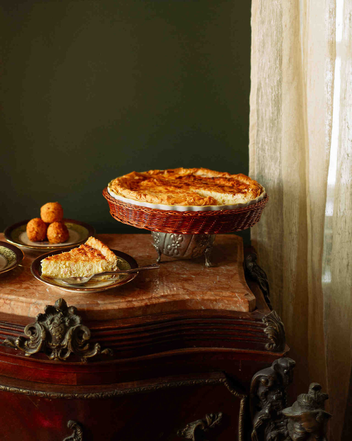 - Κόβουμε τις άκρες των φύλλων που εξέχουν και τα γυρίζουμε ελαφρά προς τα μέσα, φτιάχνοντας περιμετρικά της τάρτας ένα λεπτό στεφάνι.
